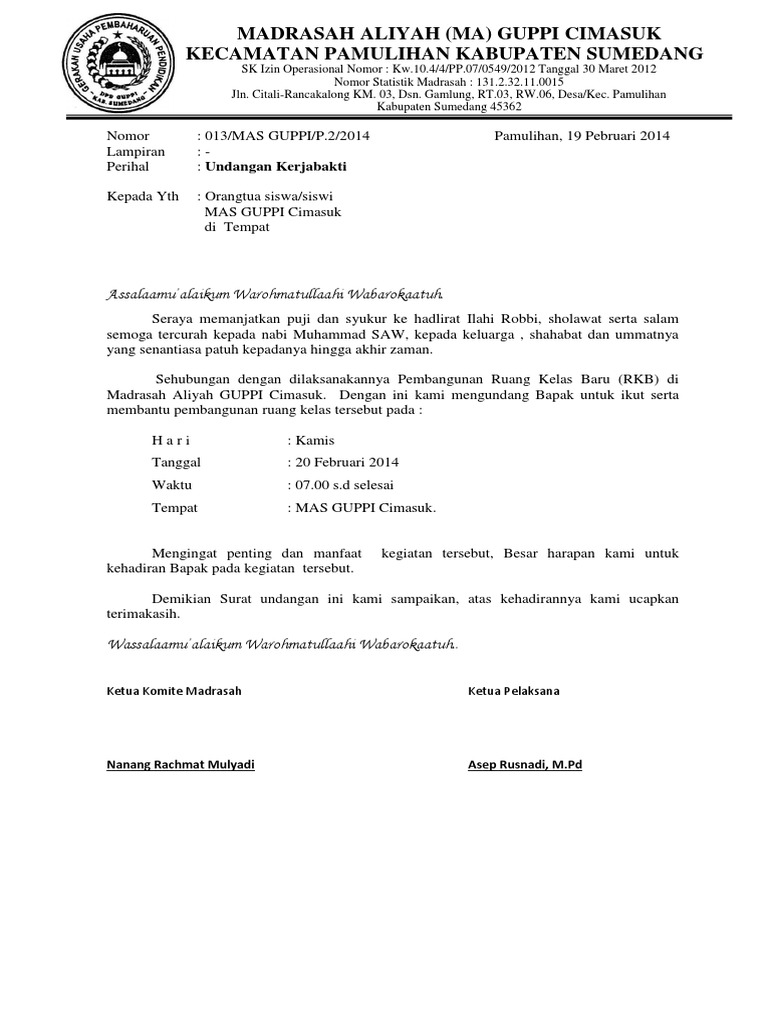 Contoh undangan gotong royong rt contoh isi undangan cuitan dokter. Contoh surat setengah resmi pengumuman kerja bakti contoh lainnya yakni surat himbauan kerja bakti yang ditujukkan kepada warga wilayah tertentu baik lingkup rt maupun rw. Apalagi setelah adanya media sosial yang bisa dengan mudah menghubungkan komunikasi jarak jauh sehingga terasa begitu dekat. Buatlah surat undangan setengah resmi dengan dihiasi lukisan. Surat himbauan resmi perayaan wajib ekaristi dan upacara. Hengki kristianto selasa, 18 juli 2017 surat resmi. Adapun contoh surat undangan setengah resmi adalah surat undangan undangan rapat rt, surat undangan kerja bakti, surat izin pelaksanaan kegiatan, dan surat izin peminjaman tempat. Berikut adalah sebuah contoh surat yang bisa anda jadikan bahan referensi untuk membuat surat undangan kerja bakti yang baik dan benar. 1 diatas termasuk surat undangan a resmib setengah resmic tidak resmid biasa2 setelah tiga brainly co id. Surat undangan kelas 5 tema 7 hal 191 195. 19 contoh surat edaran resmi perusahaan sekolah. Setelah melekukan rapat antar pengurus desa, semisalkan rt, rw, kepala desa dan perangkat desa lainnya maka langkah selanjutnya adalah kita membuat surat undangan untuk warga desa tersebut. Menindaklanjuti kerjasama antara direktorat pembinaan pengembangan kurikulum dan dinas pendidikan dan kebudayaan kota malang terkait peningkatan pengetahuan tentang penyelenggaraan pendidikan.
